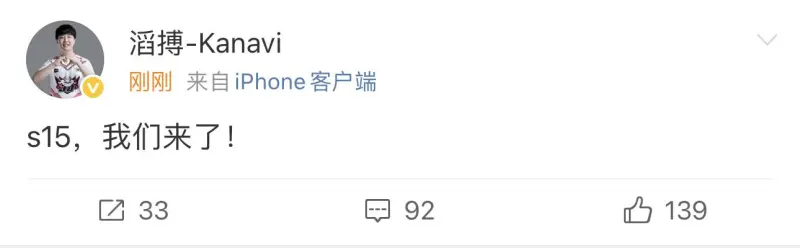 虎扑09月25日讯 战胜IG晋级世界赛后,TES打野Kanavi发文:S15,我们来了!