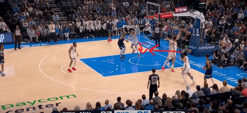 雷霆前场三对三,SGA面对底线附近的严防,身后切特迅速切入篮下,利用爱德华兹和戈贝尔的注意力接SGA高抛完成终结:
