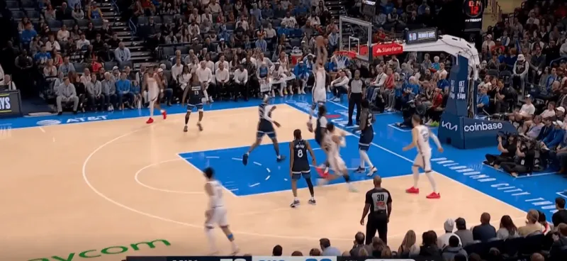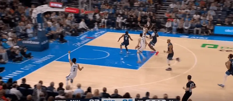进攻端,SGA错位单打被截停,转身后找到从翼侧提上接应的切特,切特迅速从中路突破,转身虚晃点起兰德尔篮下轻松得分: